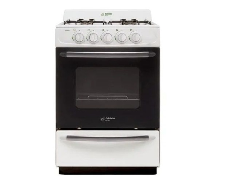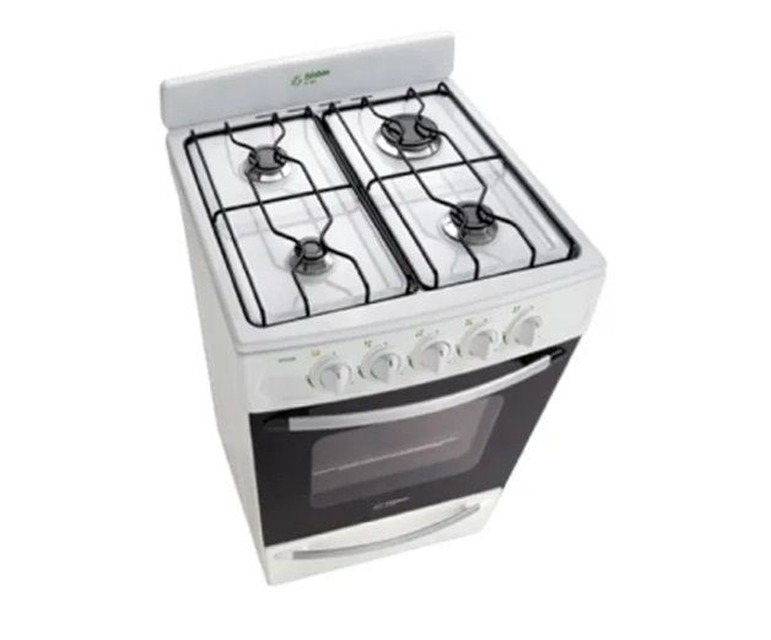 Cocina a gas de 4 hornallas enlozada color blanco. Válvulas de seguridad en horno y hornallas. Interior de horno y parrilla enlozado “autolimpiante”