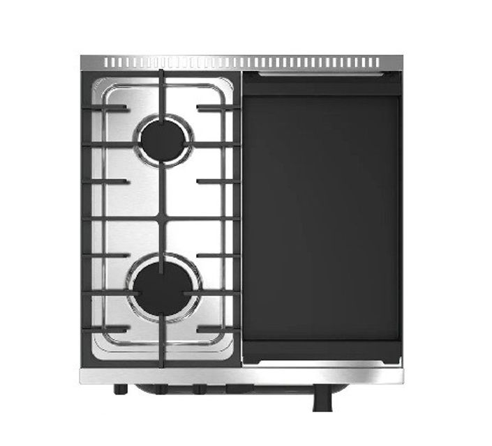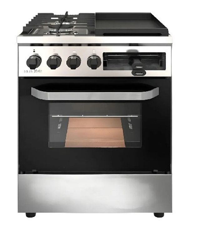 Frente en Acero inoxidable. Mesada en Acero Inoxidable. Laterales en chapa pintada gris. Rejillas de fundición vitrificadas livianas. Bandeja anti derrame de acero inoxidable. Válvula de seguridad en el horno. 3 Guías para parrillas en el horno. 1 Parrillas para el horno. Piso con ladrillos refractarios (3 unidades). Puerta de horno con vidrio templado. 2 Hornallas redondas de aluminio con tapa vitrificada. Plancha con tostador debajo. 2 Mecheros de 1200 calorías. 1 Mecheros de Grill de 1800 calorías. Horno grande de 3300 calorías.