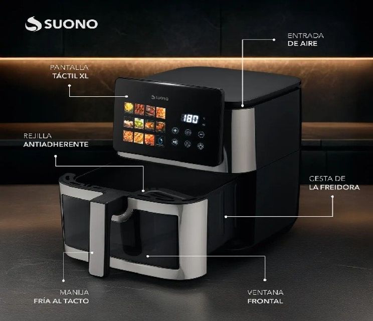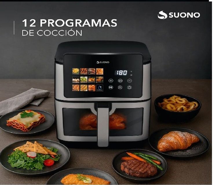 La AirFryer Digital 8.5L Dual Suono es ideal para quienes buscan practicidad, rapidez y resultados más saludables en la cocina. Gracias a su tecnología de convección de aire caliente y su resistencia dual, logra una cocción uniforme y pareja tanto arriba como abajo, reduciendo el uso de aceite y garantizando texturas crujientes en cada preparación. Características destacadas -Potencia de 2400W: Calentamiento rápido y eficiente. -Gran capacidad de 8.5L: Perfecta para preparar porciones abundantes para toda la familia. -Pantalla táctil XL Full Color: Control moderno y sencillo con un toque. -Resistencia dual superior e inferior: Cocción uniforme y resultados más parejos. -Temperatura ajustable entre 80° y 200°C: Versatilidad para diferentes tipos de recetas. -12 programas predefinidos: Incluye funciones especiales como Deshidratar y Descongelar. Más saludable: Prepará tus comidas favoritas con menos aceite. Versátil: Freí, deshidratá, descongelá y cociná múltiples recetas con resultados profesionales. Eficiente: Gracias a su doble resistencia, reduce tiempos de cocción y mejora los resultados. Diseño moderno: Su pantalla XL Full Color y su estilo compacto elevan la estética de tu cocina. Especificaciones físicas -Peso del producto: 6.3 kg -Dimensiones del producto (L x An x Al): 29 x 40 x 38.5 cm -Peso de la caja: 6.3 kg -Dimensiones de la caja (L x An x Al): 41 x 33.4 x 41.7 cm AirFryer Digital 8.5L Dual Suono: potencia, capacidad y cocción perfecta en tu cocina. Transformá tus recetas en preparaciones más rápidas, crujientes y saludables.