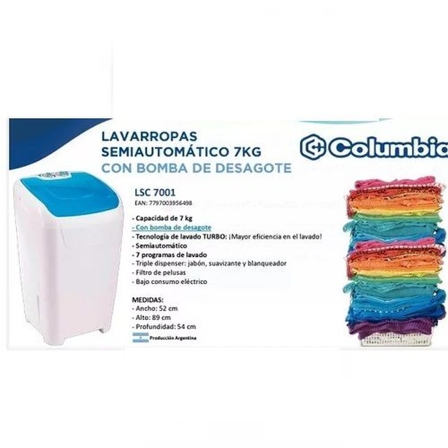 Lavarropas Semi Automático Columbia, con tecnología de lavado Turbo, que garantiza una mayor eficiencia en cada ciclo de lavado. Con una capacidad de 7kg, ofrece 7 programas de lavado, adaptados a diferentes tipos de prendas. La carga manual de agua te brinda mayor control y flexibilidad para ajustar la cantidad de agua según la carga de ropa. Cuenta con un triple dispenser que permite la dosificación precisa de jabón, suavizante y blanqueador. Con un filtro de pelusas incorporado, evita la acumulación de pelusas y residuos en tus prendas. Su eficacia en el lavado se destaca por su bajo consumo eléctrico. Su bomba de desagote facilita el vaciado del agua.