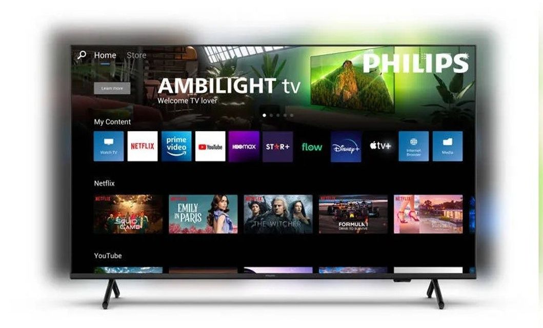 Televisor smart LED google. Ambilight. Pantalla de 70" 4K Ultra HD (3840x2160). Tamaño diagonal de pantalla (métrico): 177 cm. Relación de aspecto: 16:9. Frecuencia de barrido: 60 Hz. Potencia de procesamiento: Cuatro núcleos. Tipo de sonido: Dolby Atmos. Potencia de salida (RMS): 20 W (2x10W). Diálogos nítidos, Mejora de graves Dolby, Sonido con IA, Nivelador automático de volumen, Nivelador de volumen Dolby, Modo nocturno. Conexiones: Wifi 802.11ac, 2x2, banda dual. Bluetooth 5.0. 4 HDMI. 2 USB. Ethernet-LAN RJ-45. Salida de audio digital (óptica). Salida de auriculares. Conector de servicio. Antena IEC75. Receptor de GoogleCast. Salida de sonido digital SPDIF: 1 (óptica). Sintonizador TDA. OS: Google TV. Aplicaciones preinstaladas: YouTube, Disney+, Google Play Movies*, Google Search, Netflix, YouTube Music, Amazon Instant Video, Apple TV, Google Play Music. Tamaño de la memoria (flash): 16 GB. Funciones de ahorro de energía: Temporizador de apagado automático, Silencio de imagen (para radio), Modo ecológico, Sensor de luz. Control remoto: con voz. Asistente de voz: Asistente de Google integrado, RC con micrófono. Soporte VESA 300x300 mm. Medidas con base (alt-anch-prof): 94.8x157.2x35 cm. Incluye: Control remoto, 2 baterías AAA, Soporte para la mesa y cable de alimentación.
